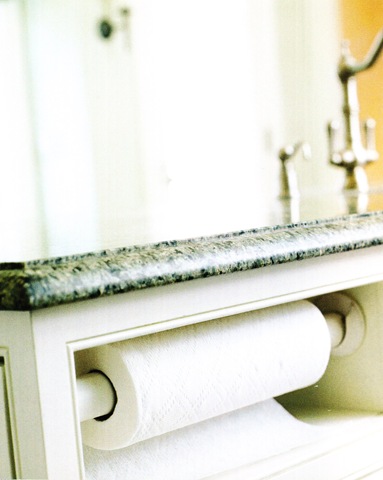^A clever way to hide the paper towel yet make it easily accessible is to mount the paper towel holder in a cubby hole under the kitchen counter. Visit Misti’s Studio M Design post to see another photo of a paper towel holder located under the kitchen counter. Click here.